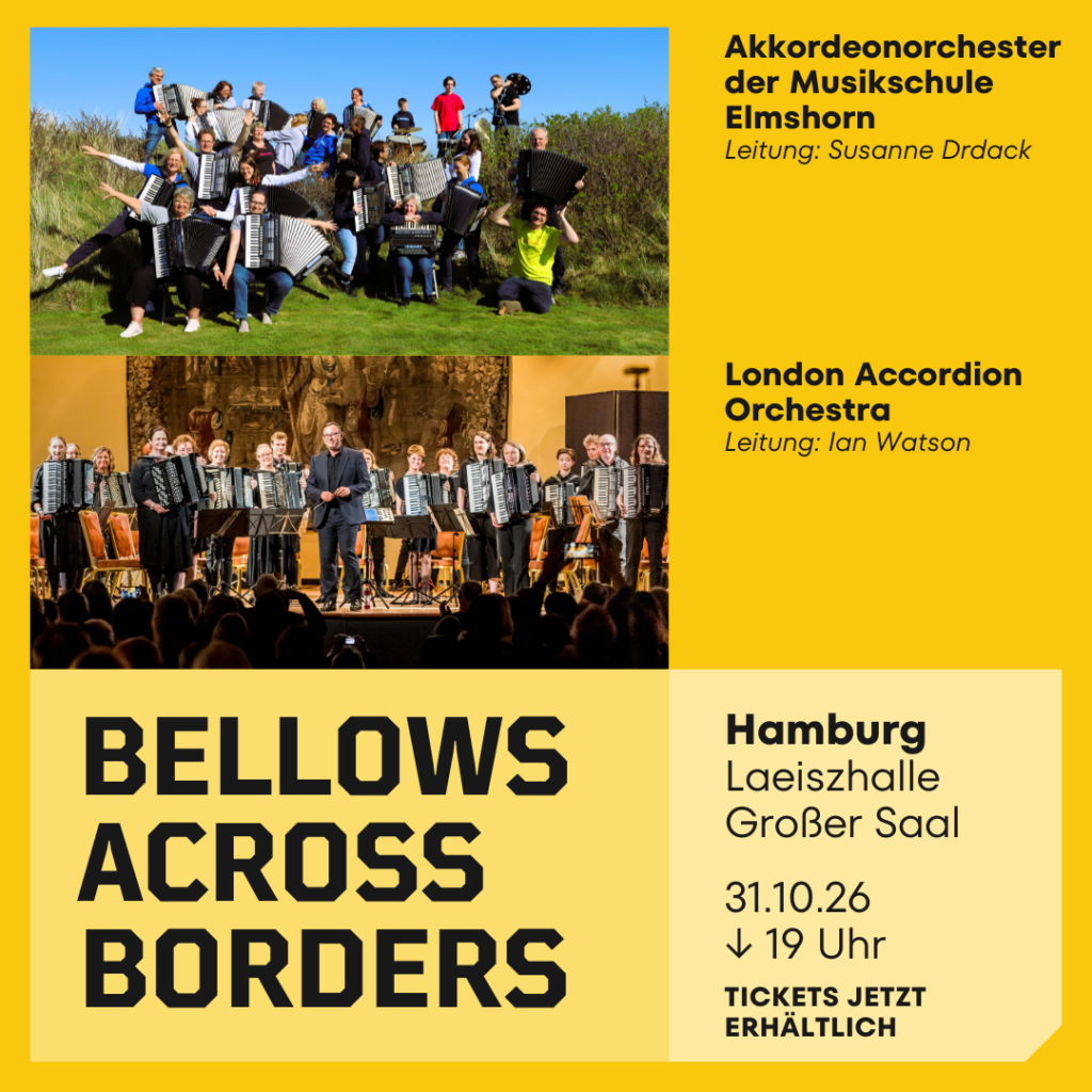 Im Jahr des Akkordeons und im Zeichen der deutsch-britischen Freundschaft lädt das Akkordeonorchester der Musikschule Elmshorn zu einem ganz besonderen Konzertabend in die traditionsreiche Laeiszhalle Hamburg ein. Unter dem Titel »Bellows Across Borders« begegnen sich zwei herausragende Orchester der europäischen Akkordeonszene: das Akkordeonorchester der Musikschule Elmshorn und das renommierte London Accordion Orchestra.