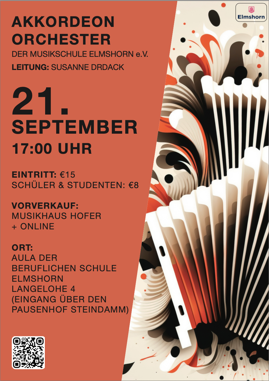 Wir freuen uns, bekanntzugeben, dass das nächste Konzert des Akkordeonorchesters der Musikschule Elmshorn e.V. am 21.09.2024 um 17 Uhr in der Aula der Beruflichen Schule Elmshorn stattfindet. Freut euch auf ein gemischtes Repertoire aus Klassik, Filmmusik und modernen Arrangements, sowie Originalmusik für Akkordeonorchester.